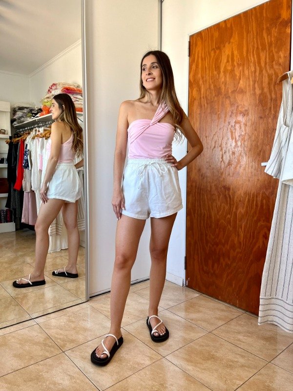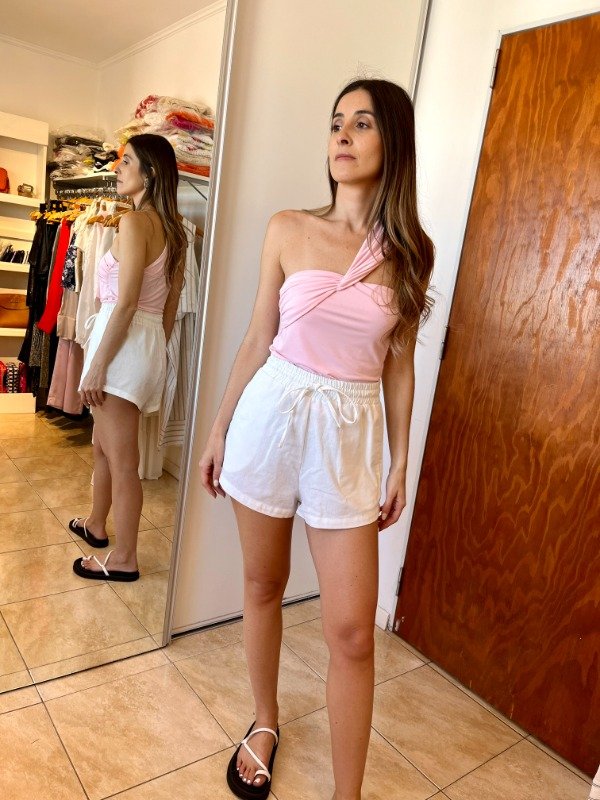 Top asimétrico, con detalle en un hombro que enamora. Es de microfibra liviana color rosa pastel.